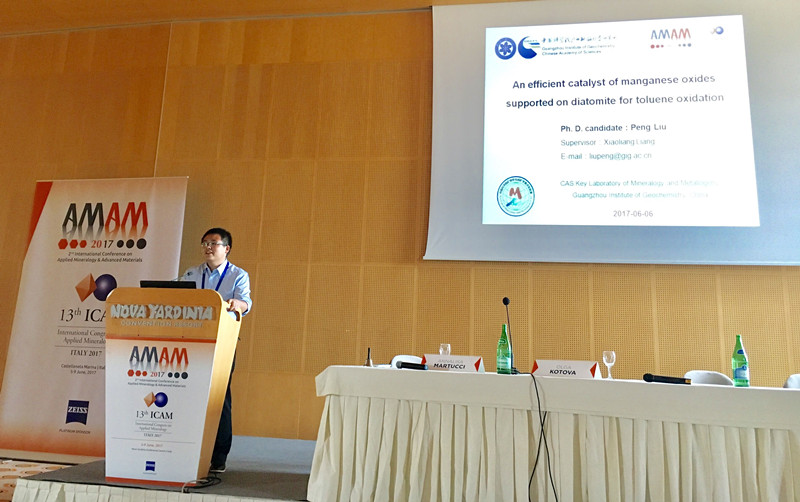 2017年6月5日-10日,徐天缘、刘鹏、刘晶三名博士研究生应意大利巴里大学Saverio Fiore教授邀参加在Castellaneta Marina举行的第13届国际应用矿物学大会。刘鹏在分组报告会上做An Efficient Catalyst of Manganese Oxides Supported on Diatomite for Toluene Oxidation 的会议报告。徐天缘和刘晶分别做海报展览Immobilized on Hydroxy-Metal Pillared Montmorillonite for the Visible Light Driven Degradation of Acid Red 18和Interaction of Polyhydroxy Fullerenes with Ferrihydrite: Adsorption, Aggregation and Degradation,并与国际同行进行交流。